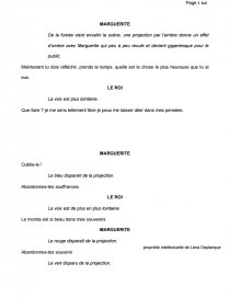 Tout en restant dans un discours didactique à travers l’absurde, ma composition devrait être articulée de deux monologues juxtaposés, représentant d’un côté Marguerite la première femme du roi dans un récit didactique pour Berangé I, et de l’autre, un roi en mort spirituelle, ainsi pour arriver à une mort totale et donc à une disparition intégrale de cet univers.