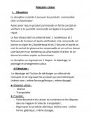 Magasin caisse 1. Réception La réception consiste à recevoir les produits commandés chez un fournisseur. Apres avoir reçu le produit commandé on fait le constat en vérifiant si la quantité commandé est égale à la quantité reçue. Le fournisseur doit se présenté avec 2 bordereaux et 2 factures de livraison et après vérification si la commande est bonne on signe les 2 bordereaux et les 2 factures et après on met le cachet du pharmacien